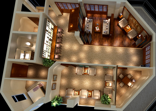 不同的空間不同的設(shè)計(jì)風(fēng)格,大廳大量運(yùn)用石材及暖色系燈光,更彰顯豪華大氣。休閑區(qū)則是舒適典雅的中式風(fēng)格。開敞辦公區(qū)的玻璃及香檳金的高隔間則又顯示出了現(xiàn)代時(shí)尚感十足。避免極端單純化傾向,給人造成形式單一、千篇一律的感覺。