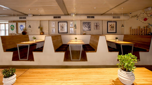 通常,設計師通過創意的設計手法讓清新的主題元素布滿整個餐廳,展示它的清新,給客人創造了一種清新主題的視覺享受。讓創意的設計理念得以展示。為來到館內的客人提供一次體驗清新自然的精神享受之旅。